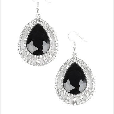 A dazzling black teardrop rhinestone is pressed into the center of a stack of teardrop frames radiating with glassy white rhinestones, creating a glamorous lure. Earring attaches to a standard fishhook fitting.
