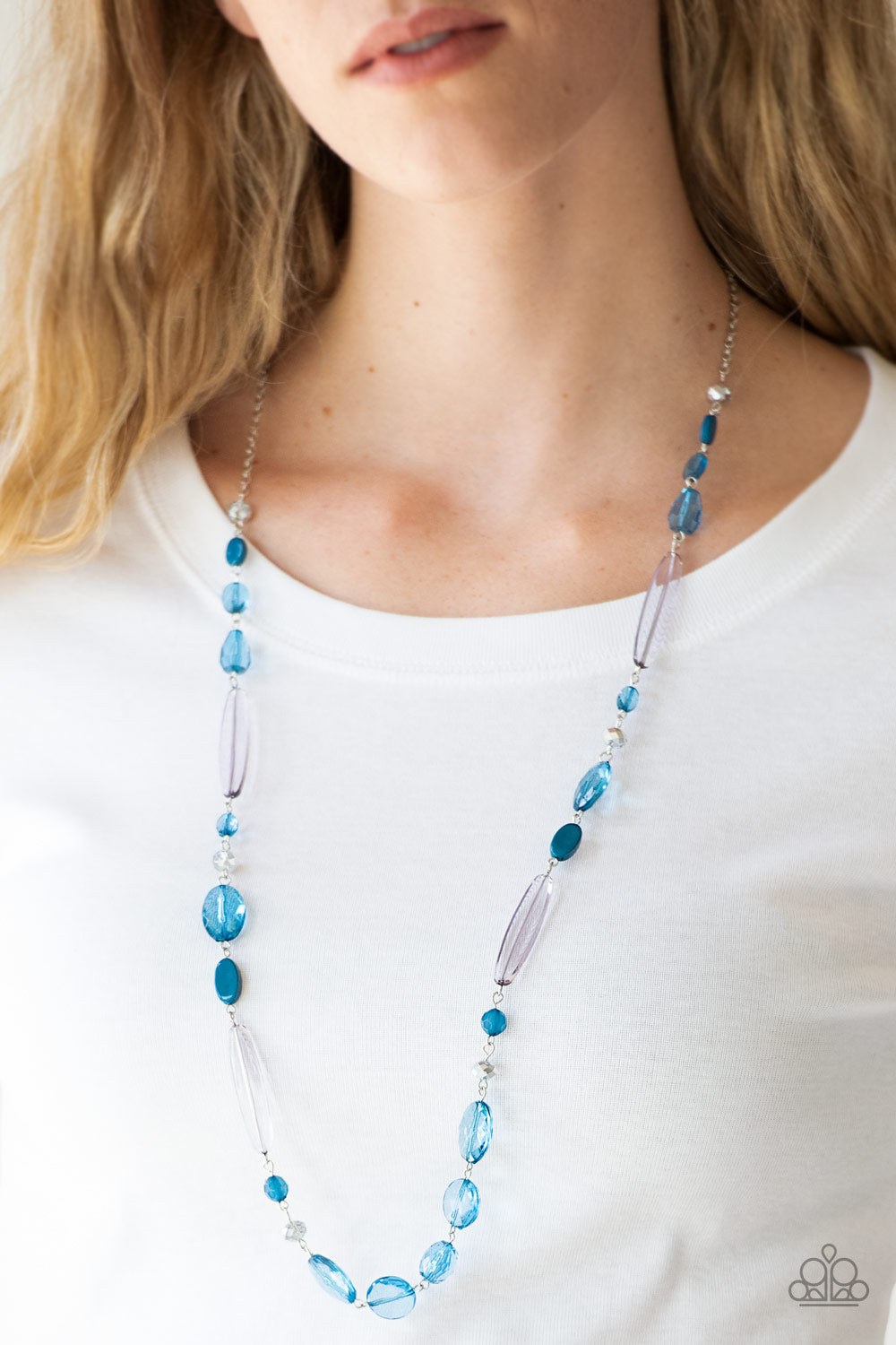 Varying in shape and shimmer, faceted blue and metallic crystal-like beads trickle down the chest for a whimsical look. Features an adjustable clasp closure.